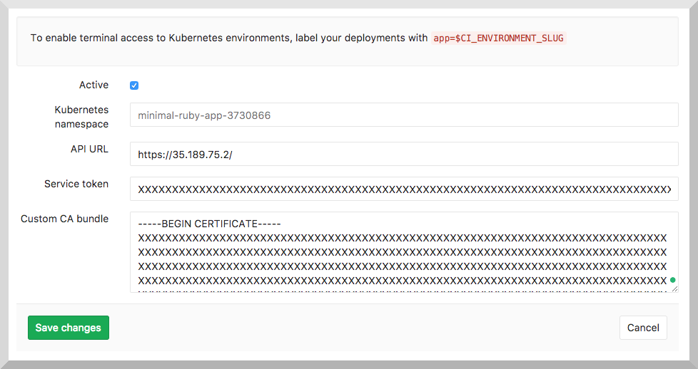 You need to copy-paste the ca.crt and token into your project on GitLab.com in the Kubernetes integration page under project Settings > Integrations > Project services > Kubernetes. Don't actually copy the namespace though. Each project should have a unique namespace, and by leaving it blank, GitLab will create one for you.